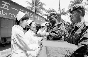 5月12日是國際護士節,聯合國利比里亞特派團第四戰區司令專程來到我赴利維和醫療分隊,看望醫護人員并向她們贈送禮物。韓曉濤攝 |