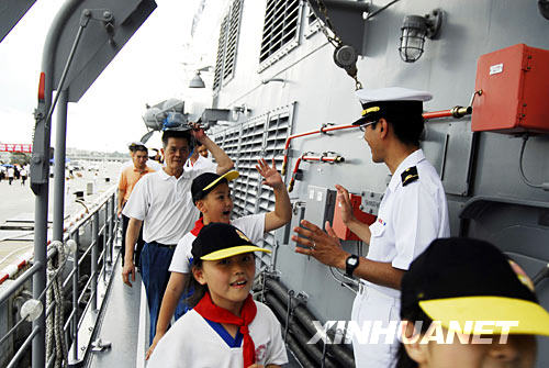 當日下午,正在中國湛江訪問的日本國海上自衛隊“漣”號驅逐艦向中國公眾開放,數百名湛江市民登艦參觀,中日雙方的軍樂隊還在碼頭為前來參觀的市民舉行了2個小時的聯合演出。演出前,中日雙方全體人員為汶川地震死難者默哀1分鐘。“漣”號護衛艦于6月28日上午離開廣東省湛江港,圓滿結束對中國為期5天的友好訪問。 新華社發(李滿青 攝)