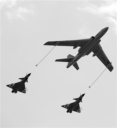 ●2008年10月,空中加油機成功實現(xiàn)同時為2架殲10飛機加油,標志著加油機部隊“隨時段升空、隨空域加油、隨機型加油”作戰(zhàn)能力的全面形成。