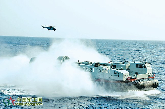 指揮員、南海艦隊司令員蔣偉烈,登上停放在“井岡山”艦塢艙里的一艘氣墊登陸艇。被譽為“海上駿馬”的某型氣墊艇,是我國自行研制的高速中型兩棲氣墊登陸艇。由于剛剛入列,這是它第一次在遠海與母艦進行配合訓練。