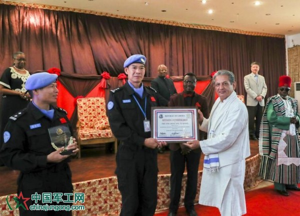 10月28日,在利比里亞蒙羅維亞,中國(guó)第五支駐利維和警察防暴隊(duì)政委陳利華(左二)接受“利比里亞國(guó)家杰出貢獻(xiàn)獎(jiǎng)”證書(shū)。