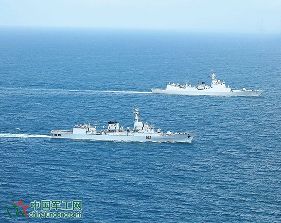 當地時間11月22日,結束參加東盟成立50周年國際艦隊檢閱活動的中國海軍導彈驅逐艦鄭州艦,在返航途中和巴基斯坦海軍導彈護衛“賽義夫”艦開展海上聯合演練。