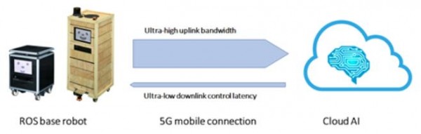 為了提高服務機器人的智能水平,本次合作的機器人將利用5G網(wǎng)絡連接到云端的AI“大腦”,由云端AI對機器人周邊的環(huán)境進行識別和分析,并將結果返回給機器人本體。5G的大帶寬提供了機器視覺和雷達數(shù)據(jù)所需的幾十兆每秒的上行帶寬和室內(nèi)室外的無處不在的覆蓋,高計算量的AI計算得以在云端而不是本地完成。這樣,機器人獲得了AI增強的同時,計算負載、功耗、尺寸和成本都得以下降。通過5G,機器人之間還可以數(shù)據(jù)共享,促進機器學習和AI進化。