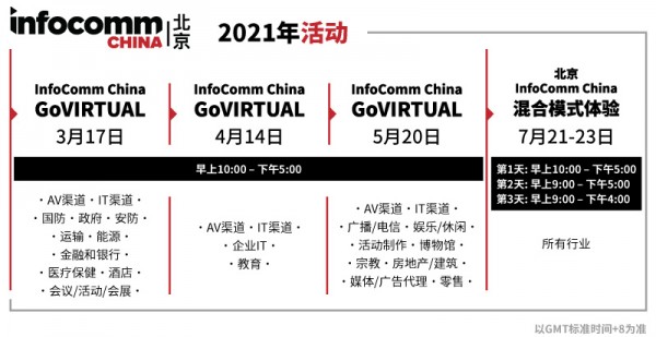 InfoComm China 2021呈獻全新模式,除了7月21-23日在北京的國家會議中心舉行線下展會,在3-5月期間將舉辦三場GoVIRTUAL線上活動。每場線上活動將側重于特定行業(yè)舉辦研討會、產品演示等,為業(yè)界提供線上虛擬+線下體驗混合模式的新體驗。
