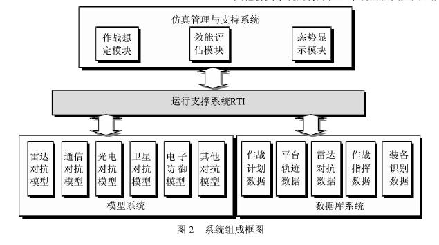 基于HLA的電子對抗仿真系統總體設計不但要充分利用HLA的優勢,而且要體現出電子對抗仿真系統與其他仿真系統的特殊性。系統的框圖如圖2所示。