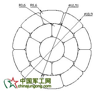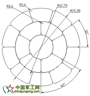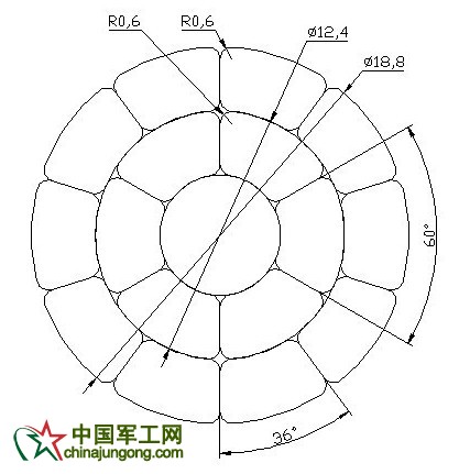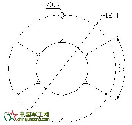 復(fù)合芯的直徑為6.0mm,則內(nèi)層鋁層直徑為(18.8+6.0)/2=12.4mm。利用AUTOCAD進(jìn)行圖形繪制,由于內(nèi)層型線是6根,則型線圓心角為60°,如圖2所示: