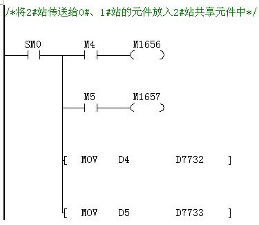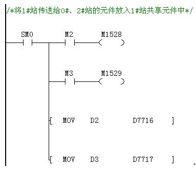 對于每臺PLC,無需編通訊程序,只需要將傳送給其他PLC的元件值放到自己的共享元件中即可,數據會自動刷新,其他PLC只要讀取相應的共享區元件值。