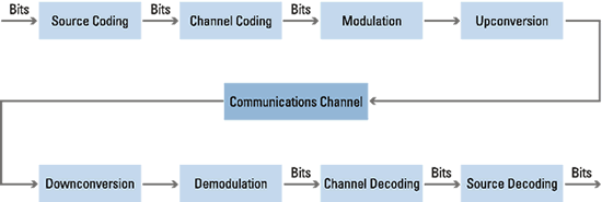讓我們先來(lái)了解一下典型的通信系統(tǒng)所包含的主要功能模塊,這將幫助更好的理解整個(gè)設(shè)計(jì)和測(cè)試的流程。